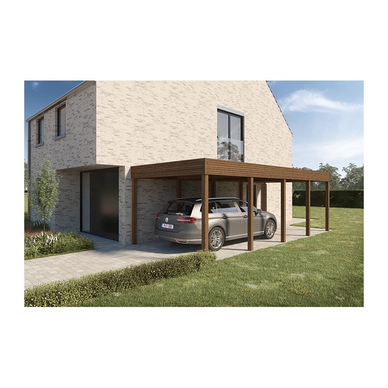 Carport mural 2 places de la gamme Kaméléon de chez Collstrop en pin thermo-traité. Dimensions hors tout de 512 x 768 cm.