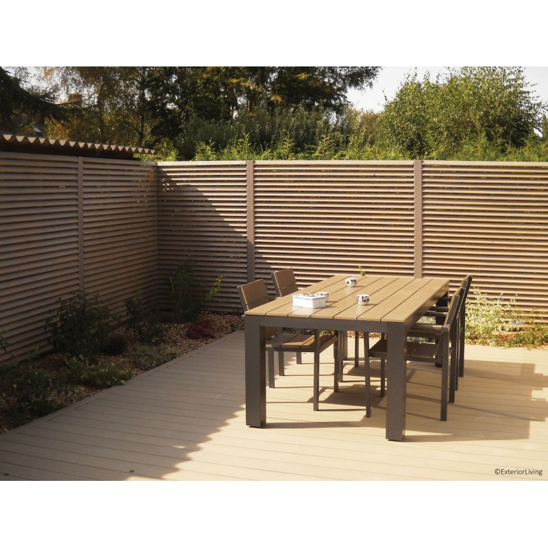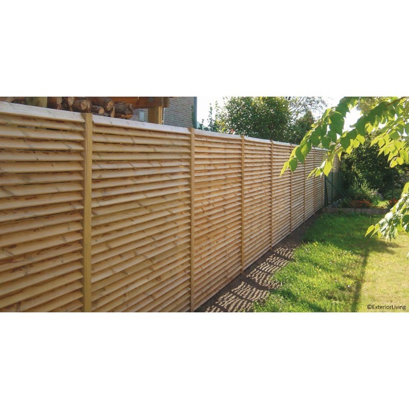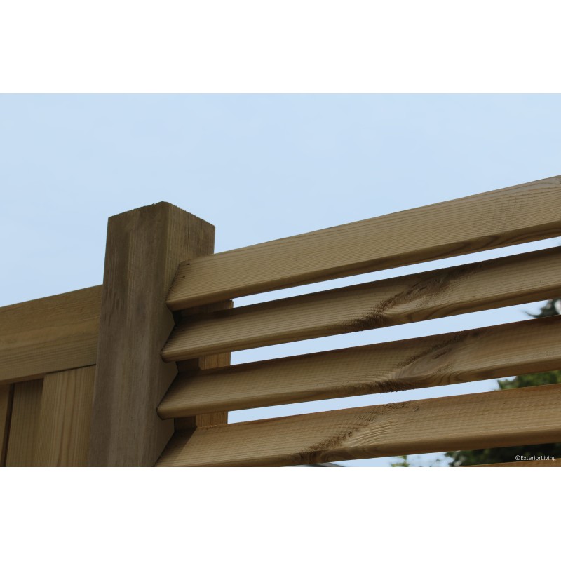 Panneau de jardin aéré avec des planches montées obliquement pour éviter une vue directe.