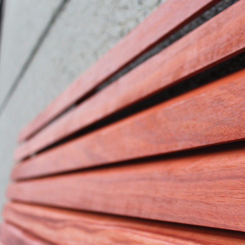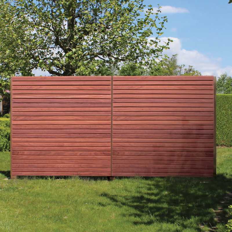 L'Aero est un paravent de jardin robuste et semi-ouvert 178x180cm en padouk avec des lames biseautées.